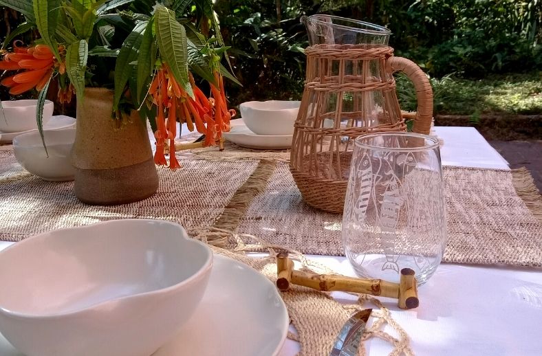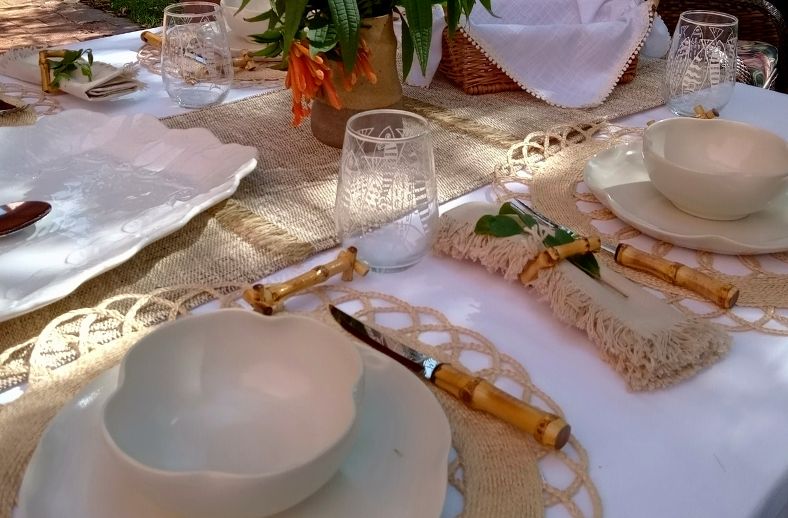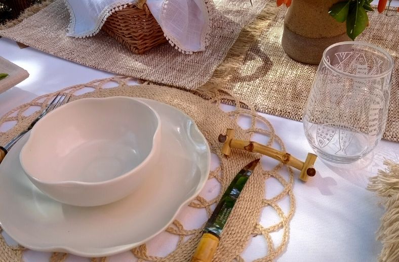 Têxteis: toalha de mesa em linho branco e jogos americanos em fibras naturais.