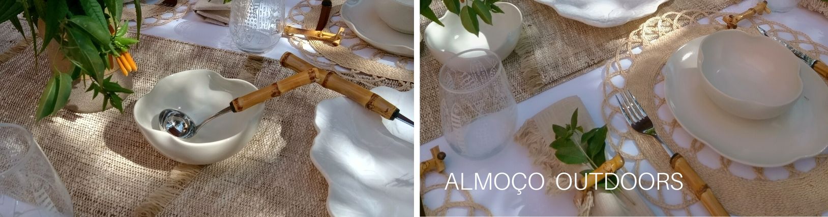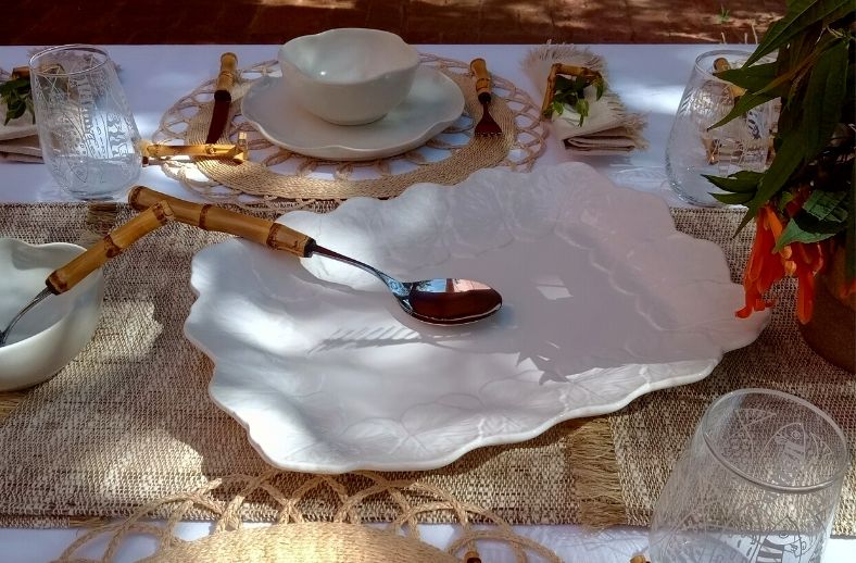 Aqui optamos pela coleção Olinda off White nossa porcelanas feitas à mão e algumas peças em cerâmica da Bordallo Pinheiro em tom de branco.