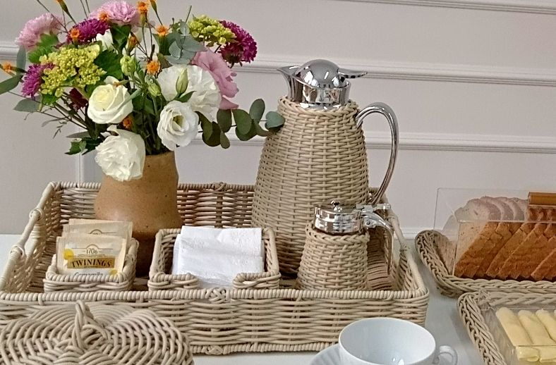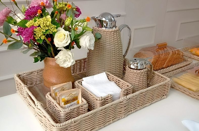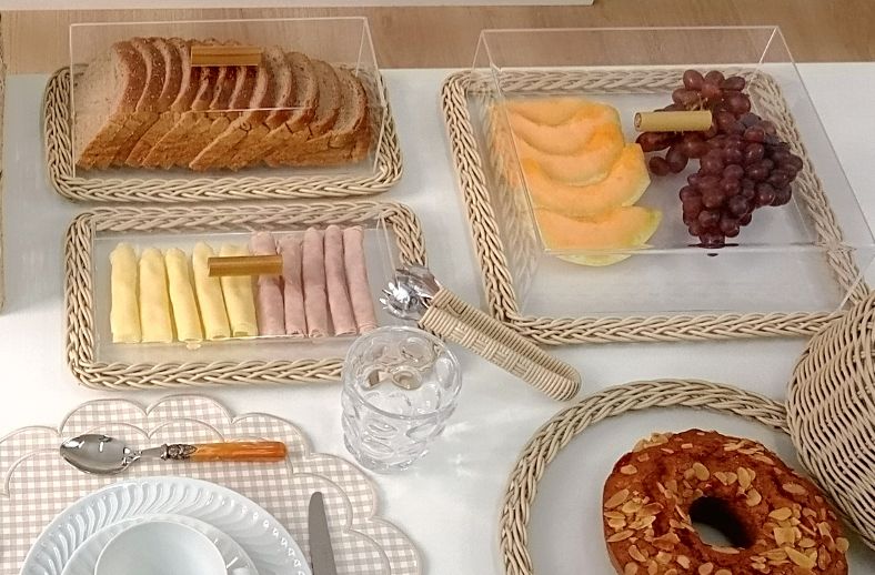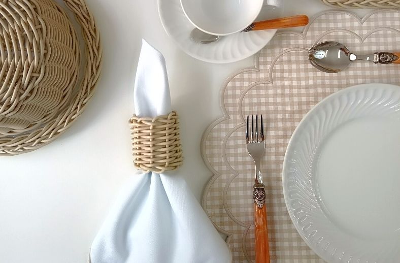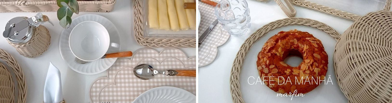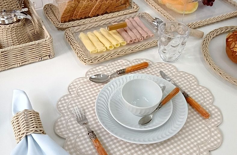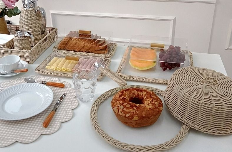Nesta produção usamos as peças em marfim, uma cor super coringa que permite inúmeras combinações com jogos americanos e talheres, além disso temos também os acrílicos para servir frios, frutas e pães que compõem a linha.