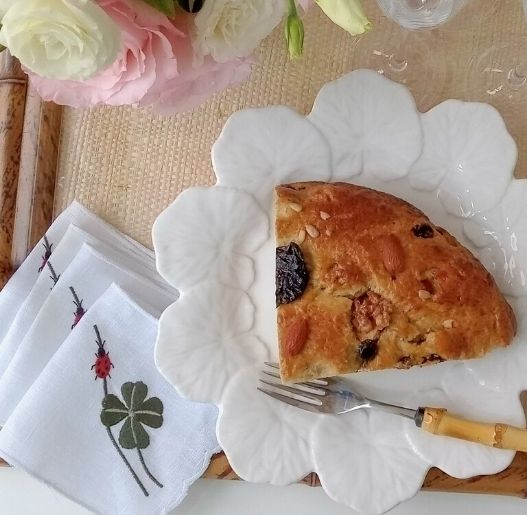 Preparação Massa – Duração 4 dias. Em um bowl acrescente 50 g de farinha ao fermento natural previamente dissolvido em água morna, amasse até formar uma massa de consistência elástica. Cubra o bowl e mantenha em temperatura ambiente descansando por 12h. Ao final das 12 horas, acrescente mais 50g de farinha e um pouco de água até conseguir manter a mesma consistência anterior. Tape e deixe descansar por mais 12 horas. Repita o mesmo procedimento acima mais 6 vezes, sempre respeitando o intervalo de descanso de 12h entre cada nova etapa. Ao total serão 04 dias e 400g de farinha. Finalizado este processo, coloque os 400g de farinha restantes em um bowl grande, no centro da farinha coloque a massa preparada nos dias anteriores, acrescente todos os demais ingredientes, frutas cristalizadas, uvas passas, frutas secas, açúcar, manteiga derretida, e o suco de ½ laranja e água morna. Trabalhe amassando esta mistura por aprox. 20 min, ao final cubra o bowl e novamente deixe descansar por 12h. Na última etapa, coloque a preparação em uma forma redonda de 30cm de diâmetro, previamente enfarinhada, pincele a massa com uma gema de ovo batida e leve ao forno pré aquecido em temperatura de 180 graus por aprox. 45 min. Sirva frio.